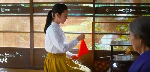 影片里就像流淌的溪水一样,浸润着观众的心,在宁静平和中使人产生很多共鸣。影片开始,女主和表姐刚开始学茶时,两人都不太理解茶道那复杂而严苛的程序和形式。两人到镰仓的海边谈心,那次影片中出现了镰仓的江之岛电车,虽然不是《灌篮高手》中的那个路口,但是却拍出了列车在海边蜿蜒行驶的场景。