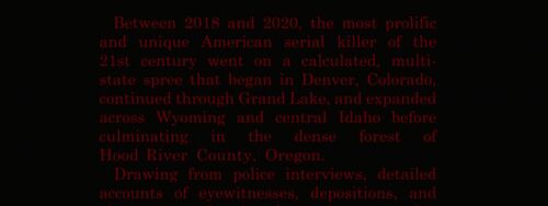 这段非常《德州电锯杀人狂》的设计,说的是一个连环杀手。大意就是2018年至2020年间,21世纪最多产且独特的美国连环杀手展开了一场精心策划的跨州杀戮狂潮。这场狂潮始于科罗拉多州的丹佛,经过大湖,扩展到怀俄明州和爱达荷州中部,最终在俄勒冈州胡德河县的茂密森林中达到高潮。 本剧根据警方采访、目击者的详细陈述、证词以及各执法部门的观察记录,戏剧化地再现了这场狂潮中最后已知的杀戮事件的真实故事。