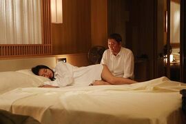 在媒体会上,有记者问,将西班牙小说改编成日本作品有什么特别的原因。王颖导演主要强调了与北野武先生合作本身所具有的吸引力。但我猜,男性的这种中年危机感,在有着男尊女卑传统的日本社会,也许会比西方国家更甚。因而,这个故事和日本社会的深层结构与日本男性的深层心理上有着暗合之处。另外,据王颖导演在媒体会上透露,因为北野武桑不喜欢念长台词,所以将原作中大量思辩性的哲学对白,改成了画面感强的情节设置。我想,这部在两位导演的商量与磨合中诞生的电影,倒是因为北野武桑这个看似任性的提案,而获得了更强的可观性。否则,假设以现在的篇幅安排上泳池谈话开始的时间为界,后面五分之四全是女人沉睡后俩个男人在泳池边的对话,那真是变成德国电影,哪怕剧场里坐的全是德国观众,也会被闷到的吧。从这个意义上来讲,我觉得如此改编还是很成功的。虽然有一个疑问:用情节转换对话,那么这些反映男性深层心理的东西,就不再全是在女人沉睡时发生,原作标题所具有的多层含义是否损失了一层?虽然,那种不能够被女人窥伺到内心想法,所以只能背着女人而进行的感觉还保留着,而男人在观看女人的睡颜时的心态也被强调着。