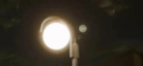 月亮的负面影响之一是逃避现实,有着“上瘾”的危险,比如梨华伪造定期存单的行为逐渐上瘾。月亮也指向暂时平静表面之下发生的微妙变化和影响,月亮深处的情绪是注定无法隐藏,汹涌的感情之潮最终一定会奔涌向某处。就像这个故事的走向,最初刘梨华平凡的生活,一步步地脱离轨道,最终一定会在朝夕间崩塌。至于“纸之月”,我觉得有两层意思,一个是假的月亮;另一个是根据纸的特性——脆弱的、易撕碎的月亮。剧中,有无数关于月亮的镜头,截选了几组我很喜欢的:第一组是“真假月亮的共存”——路灯作为前景,月亮为背景,又大又圆又亮的路灯乍一看就像月亮,可它是假的,真实的圆月显得黯淡无光。这个镜头暗示着一些“假象”,表面美丽,实则虚假。故事里有很多这样的假象,比如梨华的婚姻、佳乙的奢侈生活。