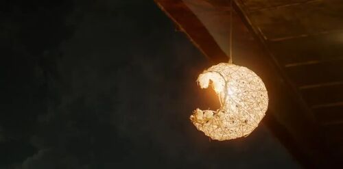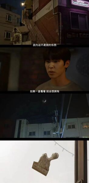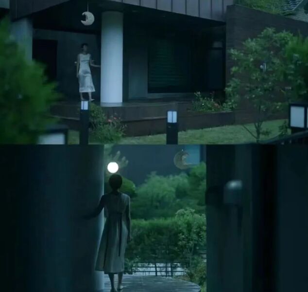 第二组是“两个假月亮”——混乱、诱惑与危险同在。玄关门口悬挂着一个纸月亮,还有另一个角度的像月亮的路灯。那时候梨华已经受到了小奶狗的诱惑、不由自主地心绪飘荡中~