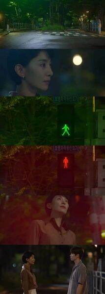 梨华是个会隐藏自己情感的人物,而她也有这个能力不被看穿。温柔内敛的外表下涌动着惊涛,可是表面什么都看不出来。就如同月亮。如何用影像表达这样的梨华所经历着的情感?有一场戏我非常喜欢,还记得一开始善英开车时说梨华善良,一次红绿灯都没闯过,那时候梨华回答:“因为没有非要过马路的理由。”这一句台词为后面的一段浪漫戏埋下了伏笔。梨华闯红灯,绿灯时她站在原地望着对面的他,一直到红灯亮起,她却坚定地走了过去。注意截图第2张位于画面右侧的光源,一个圆圆的小灯,在这里是“假的月亮”,是梨华隐藏之欲望的显现。