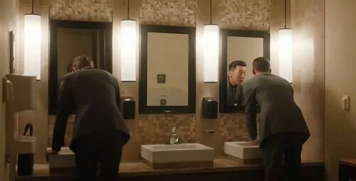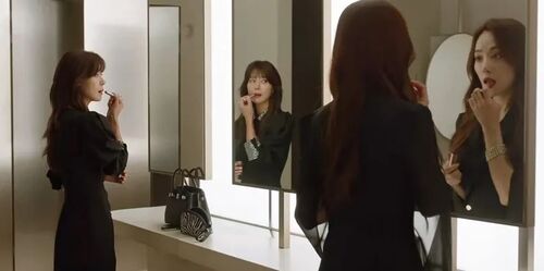 最后想说的镜头语言,是关于镜像的运用,这部剧有好多镜像,可能因为重要意象——月亮有折射太阳光线的特质,而镜像是折射人物内心的常见手法,所以运用特别多。我想特别提的是镜像组成的奇妙对照组,一个是佳乙和前夫的小三第一次在化妆间相见,一个是小奶狗和梨华老公在洗手间。这两段本质差不多都是“原配见小三”,又用了类似的镜头,可以看作奇妙的前后呼应。两个女人的撞鞋撞香水,只能说渣男前夫对女人的取向、品味很相似;而两个男人干脆穿着一模一样的衬衫、西装、领带,梨华同样的东西买两套,一套给原配一套给情人,现实中不少男人对妻子情人会做的事?但是这里却是一个女人对两个男人,让两个男人在洗手间撞衫,有种性别反转带来的戏谑感。镜子的作用,除了剧情上方便更快的观察到另一人的存在,镜像的深层作用是映出两个对象本质的相似性。佳乙和前夫小三品味相似,对男人的评判标准也相似(“做得好”);而小奶狗和梨华老公呢,他们的相似体现在,被金钱所哄抬的优越感——第9集在餐厅,奶狗的表现和梨华老公并无二致。