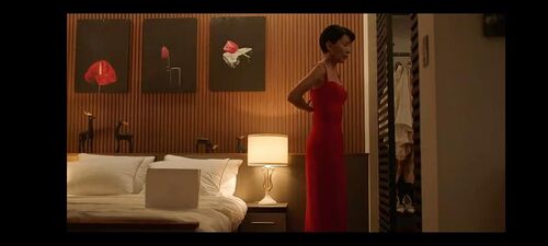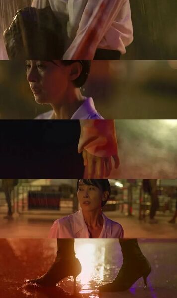 镜头特写染血的袖子被大雨冲刷,甚至鲜红的血迹已经有些被冲淡成粉红色,也许有一层“冲刷罪恶”的意思。虽然血迹的来由并不是她杀了人,而是朴炳植被别人捅一刀,梨华只是目击者,沾到了血。但她没办法面对那错综复杂的状况,一旦警察来了,她就无法脱身了,毕竟因为“现金雨”和李楼利的尸体被发现,警察已经在找梨华了。梨华牵扯到的罪太过混乱、复杂,而鲜血是最直观的表达,如同一个触发器。她穿着沾血的衬衫,狼狈地开始了逃亡之旅。抽象层面理解的话,梨华在韩国沾染的罪,初到泰国时被一场大雨冲刷,雨水本身有冲刷、洗净的特质,也是电影中常用的,想起《掮客》中IU的台词:“我有时会做梦,梦见下雨···雨会把昨日的我冲洗干净。”来到一个完全陌生的地方,一场大雨仿佛能冲刷、洗净昨日的罪恶,然后继续走下去(于是有一个迈开脚步的特写镜头)。