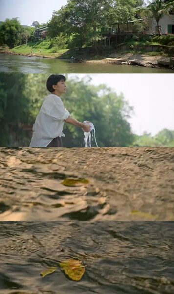 不过这和小奶狗在大雨中悔恨不同,那场戏雨水的作用是情感的倾泻,他意识到自己对梨华的爱、他的初心,但是一切已经覆水难收,雨水就是这种强烈的情感的象征,同时也渲染着悲伤氛围。关于梨华的水意象,更明显、频繁出现的场景,是在梨华和被她救下的小男孩一起回到他家民宿后,梨华在河边洗衣服,这里又有一个洗净、洗涤的动作,镜头特写河水的流动,叶子随着水流被推向远方。