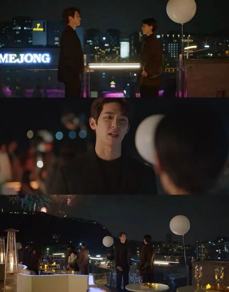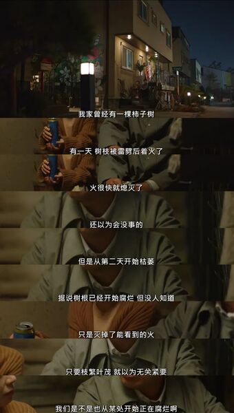 灭掉了表面能看到的火,只要枝繁叶茂就以为无关紧要,而某处开始正在腐烂、正在枯死······很明显这段话隐喻着剧中人物逐渐失控的命运,某个程度上也是对故事反思、表达创作者观点的台词——“我们是不是也从某处开始正在腐烂啊。”这段话中提到了火,火元素带着毁灭性的特质,火的出现,意味消失或者销毁。比如,烟火。这是一个很隐晦、抽象的烟火分手场景——在绚丽绽放的烟火中,曾象征着爱情的一轮弯月不光是黯然失色,更最终消失于夜空,一段爱情被彻底地隐藏、消毁了。小说中有一段烟火描写,不过不是用于分手场景,那时梨华还觉得他们无论发生什么都不会分开,因为,比感情羁绊更紧密连接着他们的,钱。“‘烟火的背后有弯月亮。’光太冷不防说道。天空中确实挂着一弯宛如剪下的指甲般的月牙。每当烟火升起,它就被隐去,当烟火的亮光被吸收般消失后,它又缓缓地露出来。”烟火是那么夺目,梨华也不禁被吸引住,因为她原本就喜欢闪耀的事物,即使是假象。补充一点,在烟火分手的场景中,不知道有没有人注意到背景的白色气球?各机位的镜头中都有明显到甚至有点碍眼的白色气球。一个顶楼看烟火的氛围式名人露天派对,怎么会用这种一点都不华丽、又很单调的白色气球道具?不奇怪吗?正如我上篇分析中提到过“真假月亮”,以及假月亮在镜头中的作用,这里就是要让我们感到违和,感到奇怪,因为,白气球在这里也是“假月亮”!