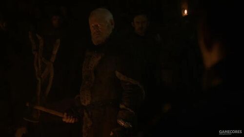 在上一集中,丹妮在她的龙和多斯拉克军队的加持下击败兰尼斯特军队。所以在这一集里,她要求失败者们臣服于她,大多数人都(在龙的「疯狂暗示」下)照做了,唯独蓝道·塔利和狄肯·塔利(两人分别为山姆的父亲和弟弟)因拒绝投降而被龙焰烧死。
