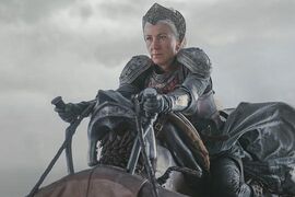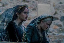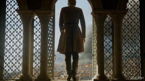 瑟曦站在红堡旁微笑地看着这一切,抿了一口酒,一阵微风拂过她的头发。不过她的喜悦很快又化为灰烬,因为她唯一的孩子托曼得知妻子玛格丽死于贝勒圣堂的消息后,万念俱灰之下摘除皇冠跳窗自尽。