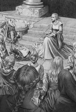 杰赫里斯的妻子和妹妹亚莉珊是坦格利安王朝前期另一位非常重要的女性角色。和雷妮亚相比,亚莉珊基于性别的权利意识显然更加明晰彻底,参与政治的积极性明显更高,她陪伴国王在各地巡游,举办“女庭”,累积见闻和观察社会问题。亚莉珊本人未曾制定法律、签署谕令,基本是通过杰赫里斯来发挥和施加影响,其生涯中涉及性别权利的改革主要包括两点。第一是为了解决寡妇的境遇问题而出台的《寡妇律》:和平时代男性一般比结发妻子活得更久,因为女性往往持久面临生育的风险,死于生产的概率较高。“不管在哪个阶层,鳏夫通常倾向于再娶,但续弦妻来到这个家庭却容易遭受第一任妻子的后代的怨恨”。《寡妇律》明确要求继承人“善待父亲留下的寡妇,不得降低其生活水准。大凡领主留下的寡妇,不管是二妻,三妻……都永远不许逐出城堡,不许剥夺她的仆人、衣饰和收入”。第二是废除了古老的初夜权陋习,规定了新娘的处子之身只属于她的丈夫,“在新婚之夜或其他夜晚强行占有她的人,无论是领主还是农夫,统统以强奸罪论处”。