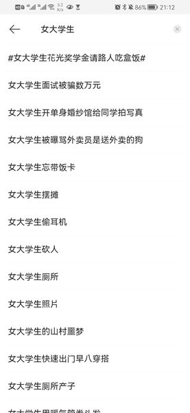 我们不难从平时的社交网络上获取各种“女大学生”干嘛干嘛了,被拐山村十几年变成生育工具后疯了,被男友pua后自杀,裸贷,厕所产子,女厕所遭偷窥偷拍,被老师性骚扰后反被退学...