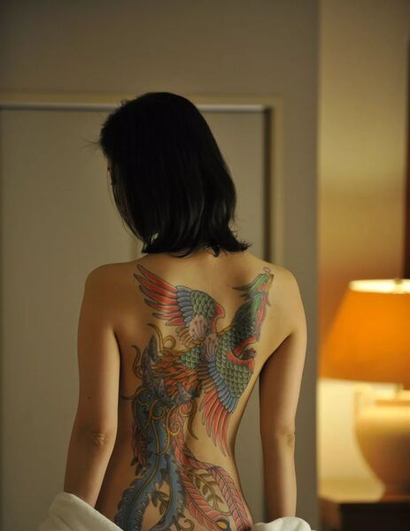 北野武的[极恶非道]系列,则满目花花绿绿,到处是背着一身刺青的黑社会。而我印象最深刻的,是一名女性成员背后的凤凰纹样。
