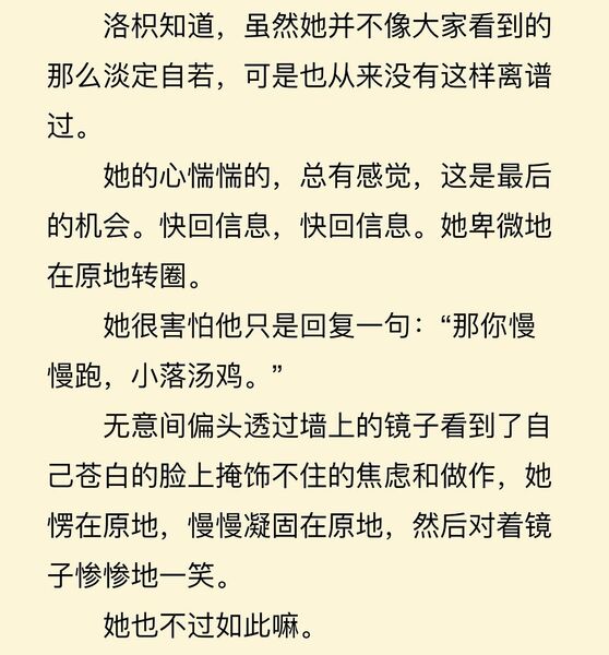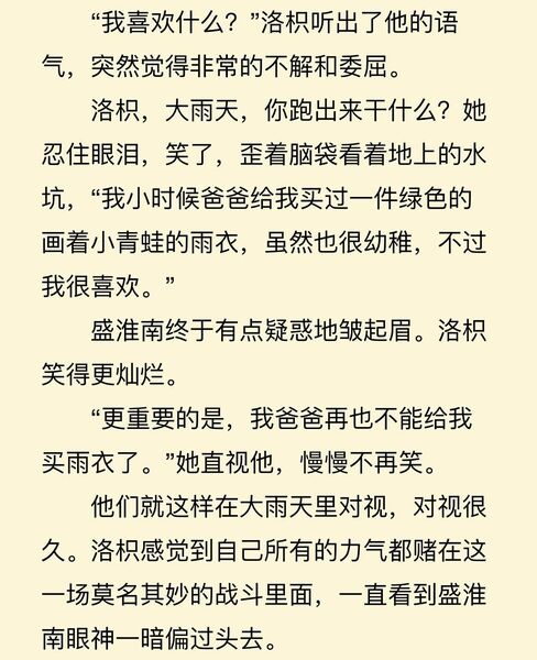 然后!就是那个雨衣!电影完全不提这和前女友的关系,摇身一变成了盛淮南给了洛枳 她父亲曾许诺的雨衣。原文的讽刺效果拉满好吗?我们洛枳也不是别人送次伞就忘记过去,开心傻乐的人好吗?她的底色一直一直都是骄傲、自持、隐忍,她也从来没有忘记过父亲,这一切都是我爱她的原因。