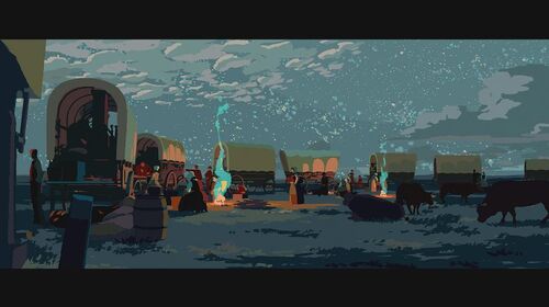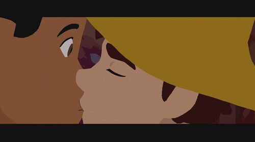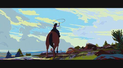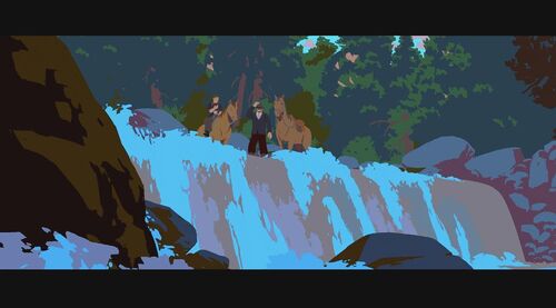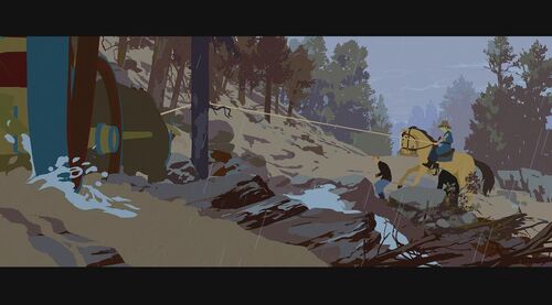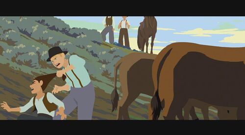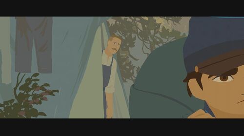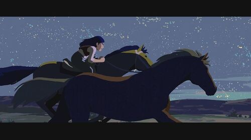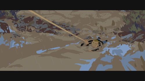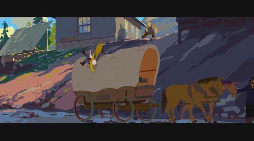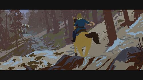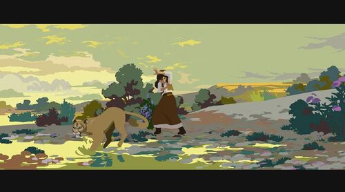 为证明自己清白,她决定自己偷偷出去找士兵要回被偷的物品。在一山上,她救了一个被熊袭击的青年,但却反过来被青年碰瓷抢走女主的马。女主那性格肯定不同意,为此两人发生争执,在前进的马车上打斗,险些双双坠崖。有两个族人出来寻找女主,刚好看到打斗场面,并看到有东西坠河,以为是她掉下去了,便脱帽致哀后回去告之族人结果。现在马车损坏严重,为继续寻找那士兵,女主跟青年谎称自己是有钱人家的娃,那两人是要来抓她回去拿赏金的,骗那个青年带她回家。青年上当了,于是两人踏上新的旅程。