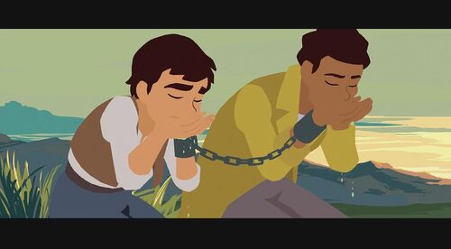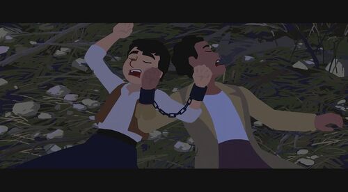 期间他们互相协助,自立更生,路上遇到3猎人,青年要求女主帮他骗人并偷走猎人的食物。女主虽然帮了他,但后面逃离路上反悔了,再次与青年发生争执,最终掉头将赃物归还猎人。猎人一脸懵逼,但还是将他们俩锁在一起,路上两人还一直争吵,猎人觉得耳根不得清净便放了他们。